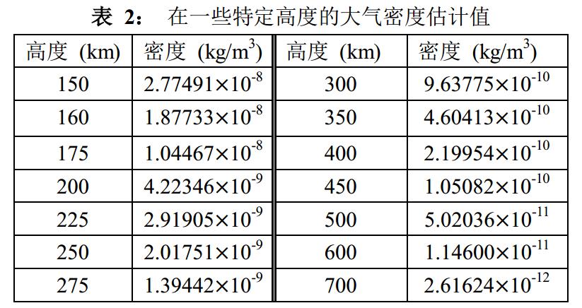 通過查閱相關參數數據得到衛星質量m=13200kg, 并假設衛星受阻面積為16m2, 對地軌道速度為7800 m/s, 即Ma= 22.9. 從表 1中我們可以得到相應的CD=0.11283. 從ρ(h)函數關系可以解出如下表所示的在一些特定高度的大氣密度估計值.